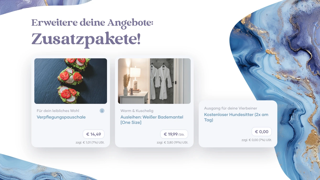 Well-designed add-ons raise the value of each booking without adding complexity to your workflow. All extensions are seamlessly integrated into marble booking, easy to manage and always transparent – for you and your customers.
