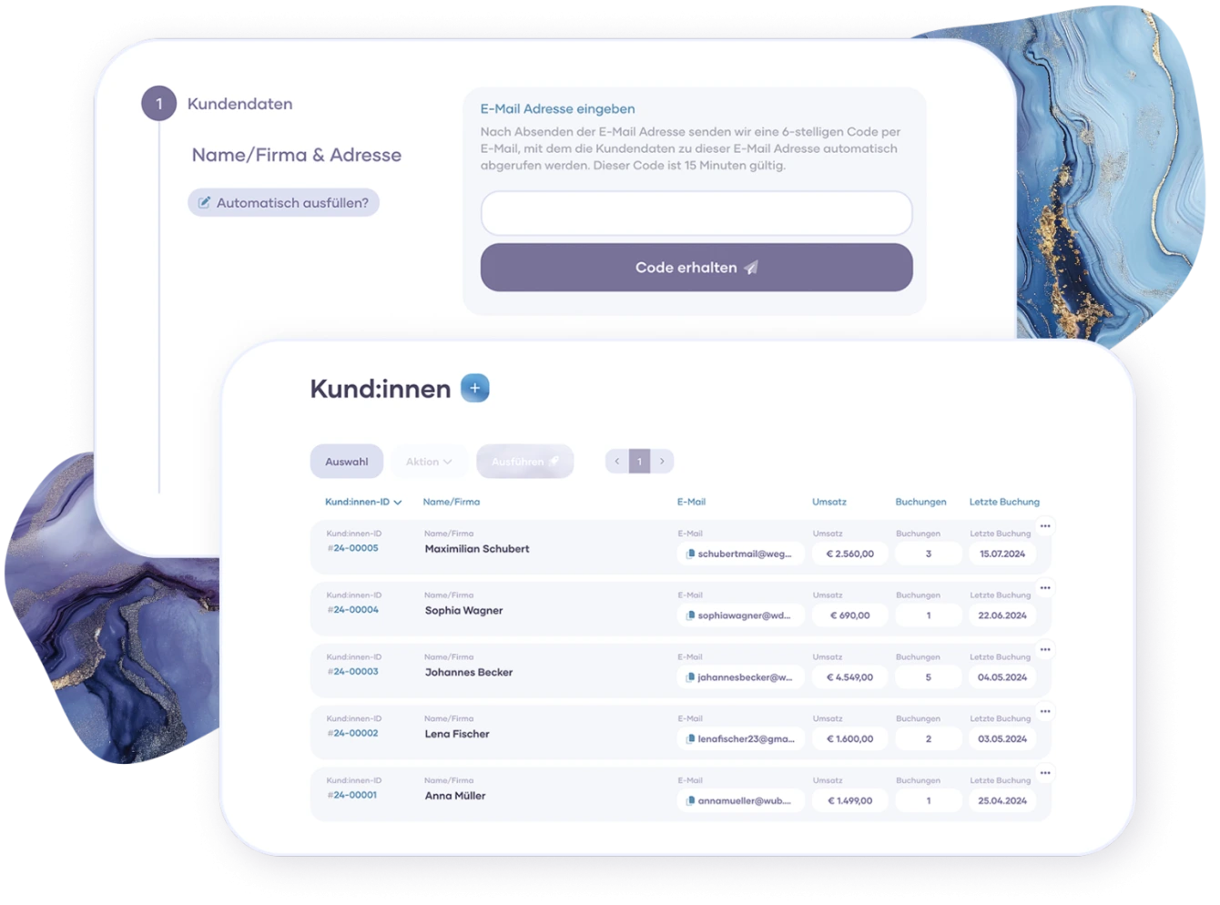 Every time your customers make a booking, a correct invoice is automatically created from the booking and customer data in accordance with German specifications. This can be exported as a PDF or sent directly from marble booking to your customer by email.
